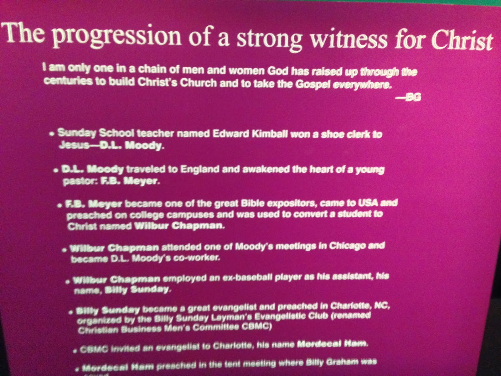 There’s a sign in the Library that illustrates the “genealogy” of Billy Graham.